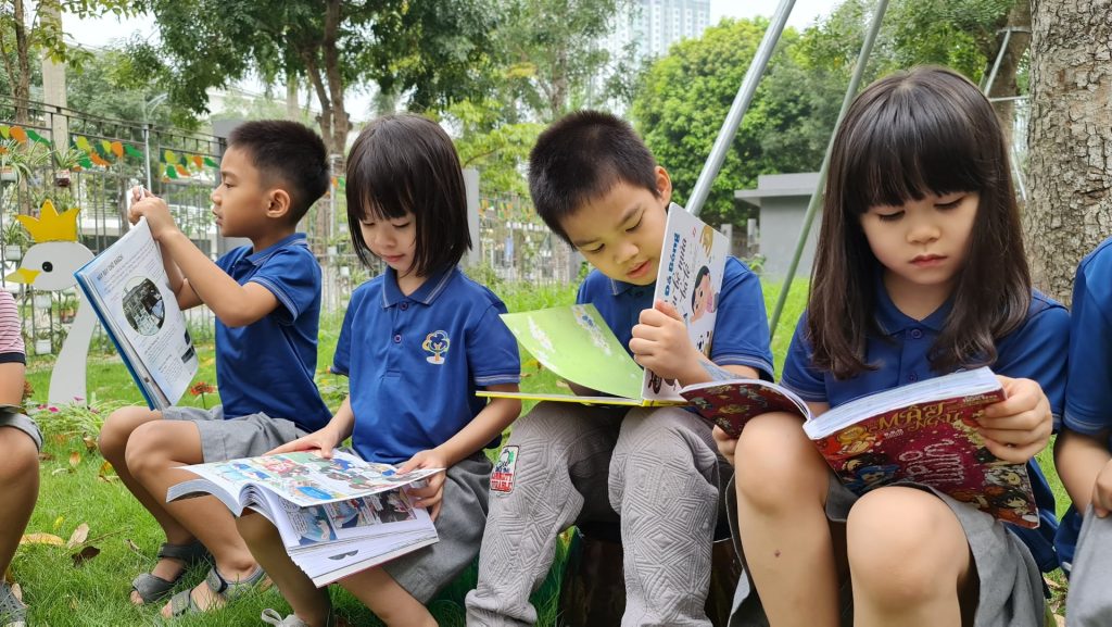 Trên tay bạn nào cũng có một cuốn sách đã được chuẩn bị từ nhà. Trong tiết trời mát mẻ của mùa xuân và tiếng chim ríu rít, các bạn say sưa đọc sách. Bạn nào lỡ quên sách ở nhà cũng không sao, thư viện mini góc lớp lúc nào cũng chờ đón các bạn đến chọn sách hay.