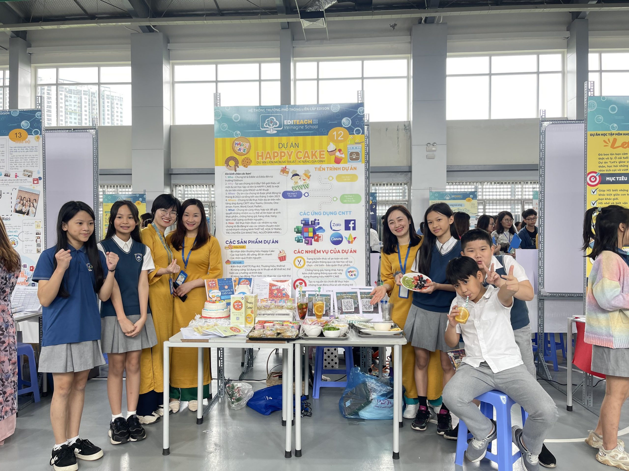 Cô Hà Hương cùng đồng nghiệp và học sinh tại gian hàng Dự án “Happy Cake” – Cuộc thi Editeach