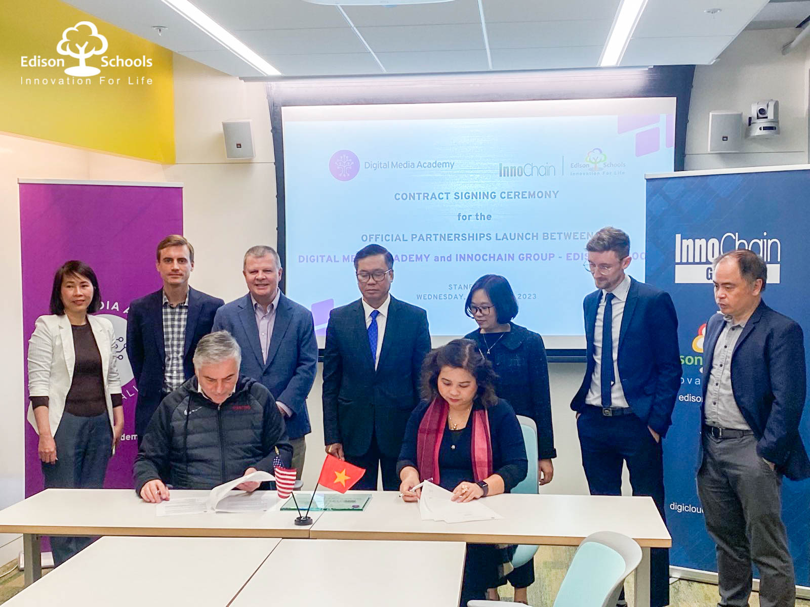 Lễ ký kết Hợp đồng hợp tác tổng nhượng quyền (master franchise) giữa Digital Media Academy – Học viện DMA và Tập đoàn giáo dục Chuỗi Sáng Tạo – Innochain Group – Edison Schools Vietnam triển khai Chương trình giáo dục Công nghệ số, Công nghệ Thông tin (CNTT), STEAM & Media dành cho Học sinh phổ thông Việt Nam đã được tổ chức vào ngày 03/05/2023 tại Trường Đại học Stanford, Silicon Valley, Hoa Kỳ. Lễ ký kết có sự chứng kiến của ông Hoàng Anh Tuấn – Tổng lãnh sự quán Việt Nam tại San Francisco.