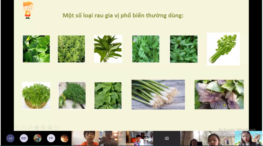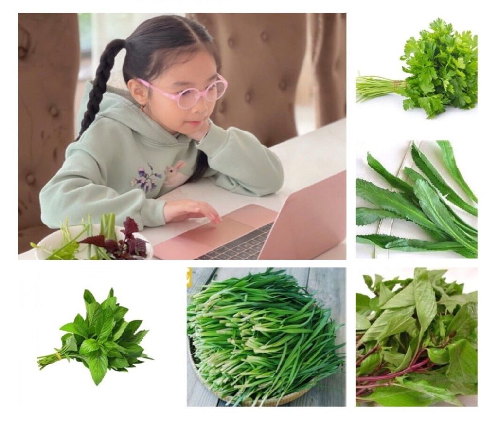 Thú vị nhất là lúc phân loại, nhận biết bằng cách ngửi và nếm. Các bạn bày rau ra xung quanh bàn học để kịp thời giơ lên trước màn hình khi cô hỏi. Có bạn lại cẩn thận dán rau vào giấy và ghi chú thích bên cạnh… Những sự sáng tạo và chủ động rất đáng khen của các cô bé cậu bé mới 7 tuổi. Xem chúng ta có gì nào:
