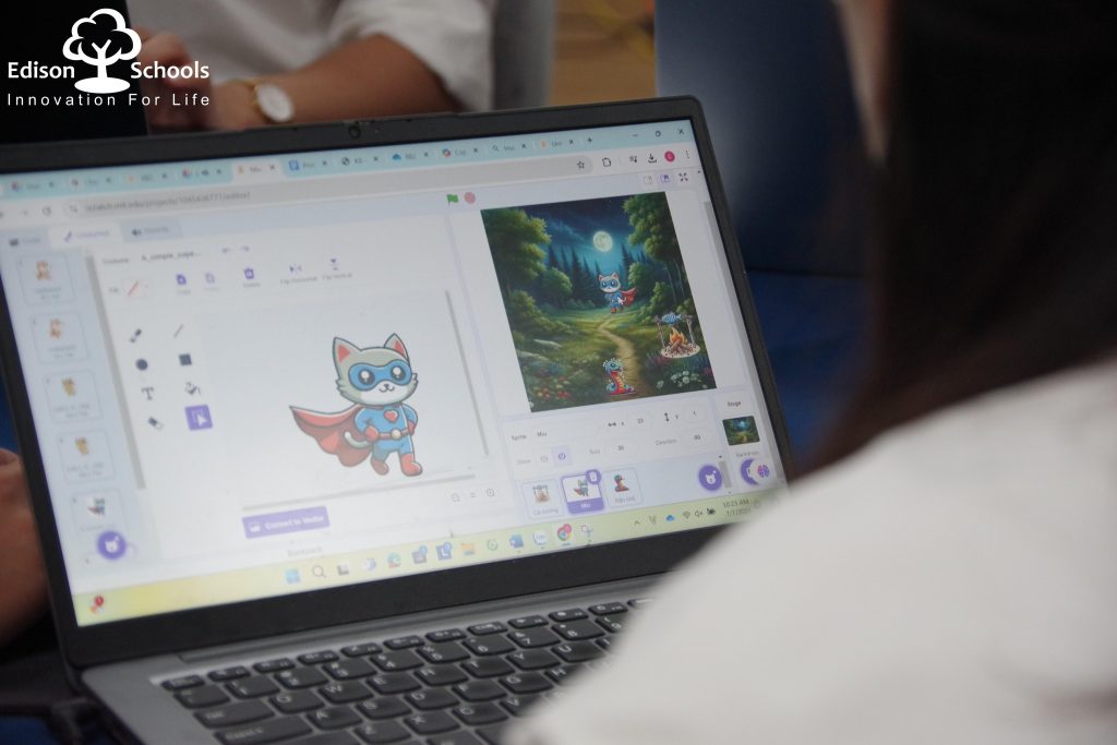 11:15, khi các cửa sổ online của các thầy cô cả nước đóng lại, là lúc các thầy cô Edison trực tiếp khoe các sản phẩm của mình: những hình vẽ, trò chơi đang dần thành hình, cử động của các nhân vật, cốt truyện và yêu cầu của trò chơi để học sinh đạt được mục tiêu học tập.