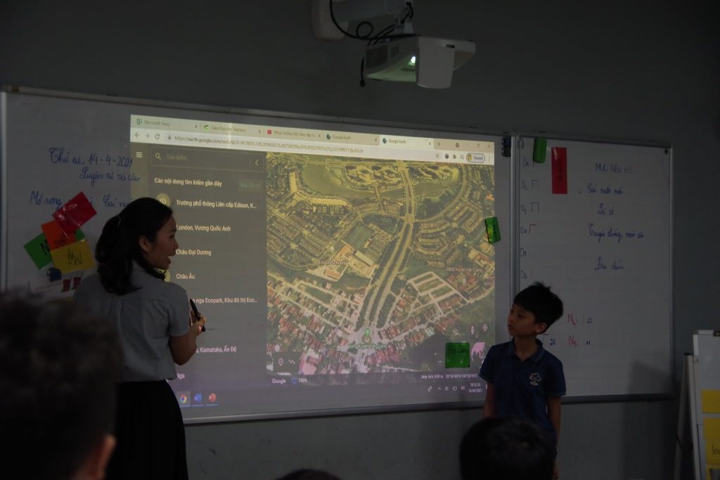 Người bạn khổng lồ Google Earth cũng khiến các bạn choáng ngợp với khả năng phi thường của mình. Các bạn nhìn thấy Công viên Hồ Thiên Nga, Trường Edison thân yêu, có bạn còn muốn xin cô giáo xem quần đảo Trường Sa, Hoàng Sa…