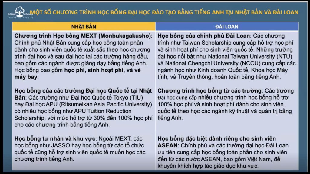 Hội thảo “Nhật bản và Đài Loan – Cơ hội mở ra với rất nhiều học bổng đại học chuyên ngành bằng tiếng Anh” do Văn phòng Tư vấn – Hướng nghiệp & Đại học – Du học Edison ( Edison University & Career Counselling ) tổ chức đã mang lại rất nhiều thông tin bổ ích cho phụ huynh và học sinh Trung học. Hội thảo đã giúp các em học sinh mở rộng tầm nhìn về du học và mở ra những cơ hội tuyệt vời từ các quốc gia có nền giáo dục hàng đầu châu Á như Nhật Bản và Đài Loan.
