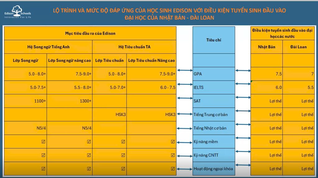 Chương trình khép lại với phần chia sẻ của cô Nguyễn Thị Kim Huệ – Phó Hiệu trưởng Trường Trung học Edison Ecopark, Trưởng Khoa Quốc Tế. Cô nhấn mạnh rằng học sinh Edison hoàn toàn đáp ứng được các yêu cầu đầu vào của các trường đại học tại Nhật Bản và Đài Loan. Đặc biệt, Văn phòng Tư vấn – Hướng nghiệp của trường luôn đồng hành, hỗ trợ học sinh trong việc lên lộ trình học tập và nghề nghiệp, giúp các em tự tin bước vào những môi trường học thuật quốc tế.
