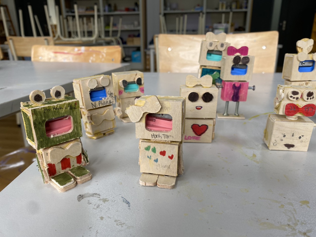 Robot gọt bút chì Bài học nằm trong chương trình chính khóa của khối 4. Với các nguyên liệu như gỗ, Đinh vít, keo dán gỗ, màu dạ mỗi bạn sẽ tạo hình và trang trí robot theo cách riêng của mình. Một chú robot gọt bút chì sẽ là 1 người bạn thân thiết luôn nằm trong cặp sách của các con để mỗi lần sử dụng lại cảm thấy thân thương, trân trọng.