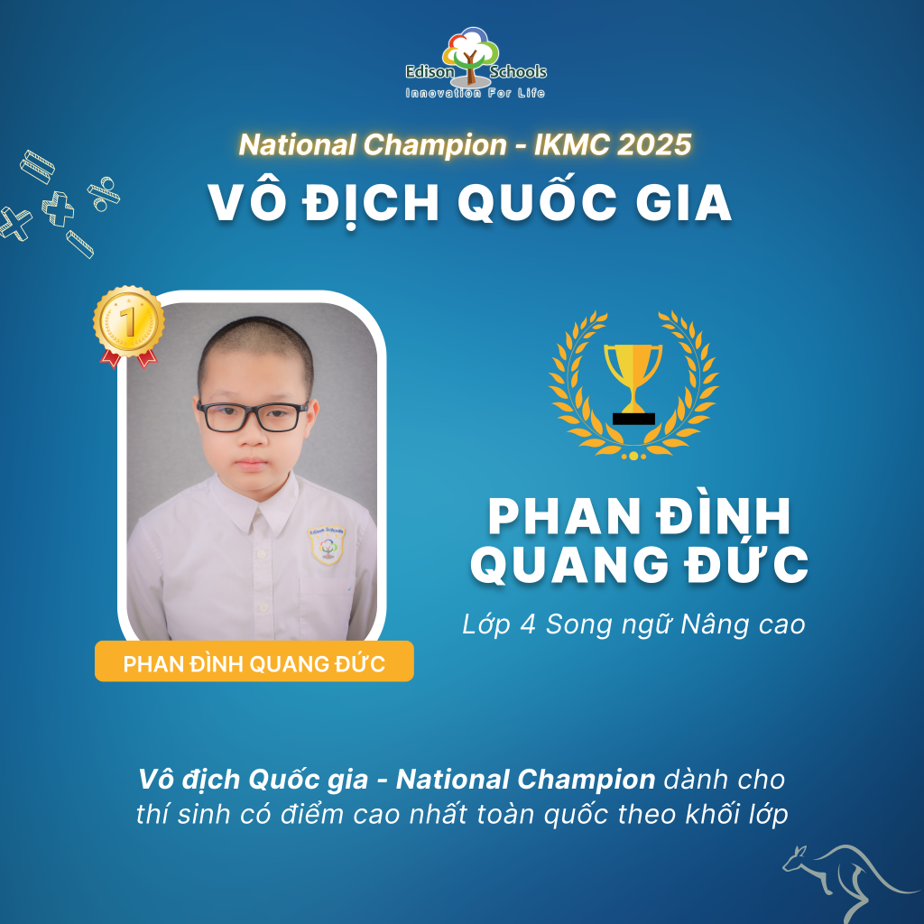 Đặc biệt, em Phan Đình Quang Đức đã trở thành thí sinh đạt điểm cao nhất toàn quốc khối lớp 4, chính thức mang về danh hiệu Vô địch Quốc gia (National Champion) đầu tiên của Trường Tiểu học Edison tại kỳ thi IKMC.