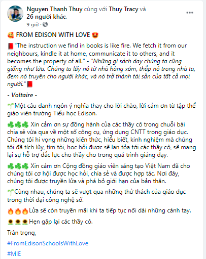Đáp lại tình cảm của các thầy cô giáo trong cả nước, bài viết sẽ kết lại bằng lời cảm ơn của cô giáo Hiệu phó Nguyễn Thanh Thủy – thay mặt cho giáo viên sáng tạo Edison Schools – tổng kết lại chuỗi chia sẻ vừa kết thúc tối qua, 9/7/2021: